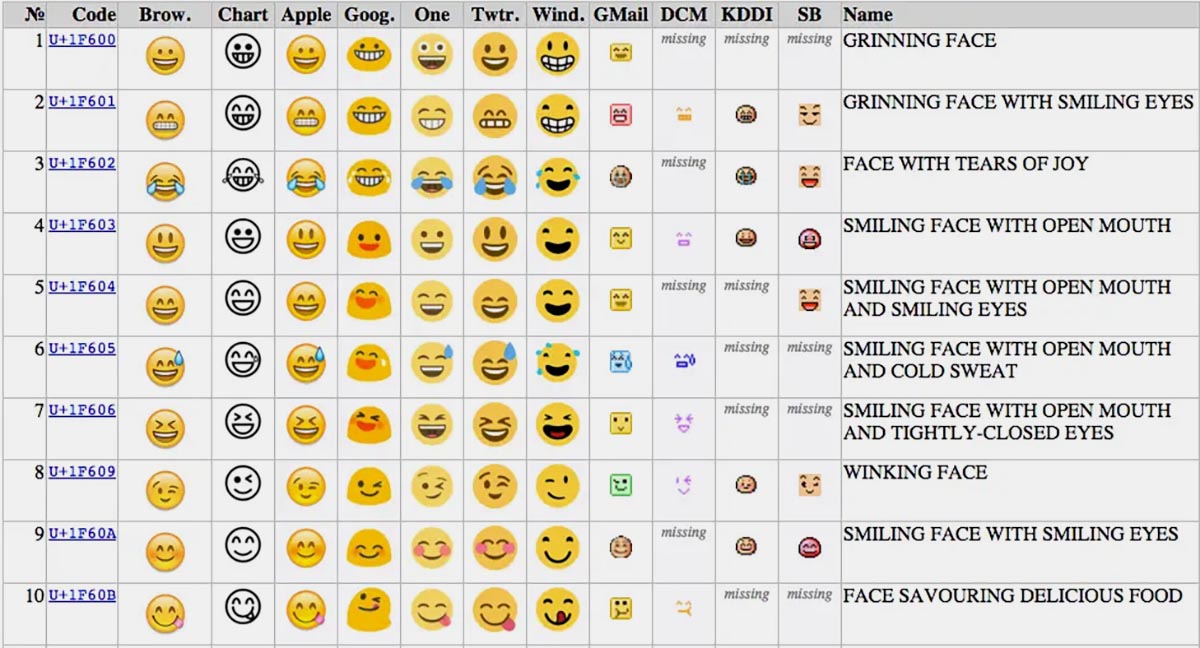Юникод-таблица эмодзи для разных ОС