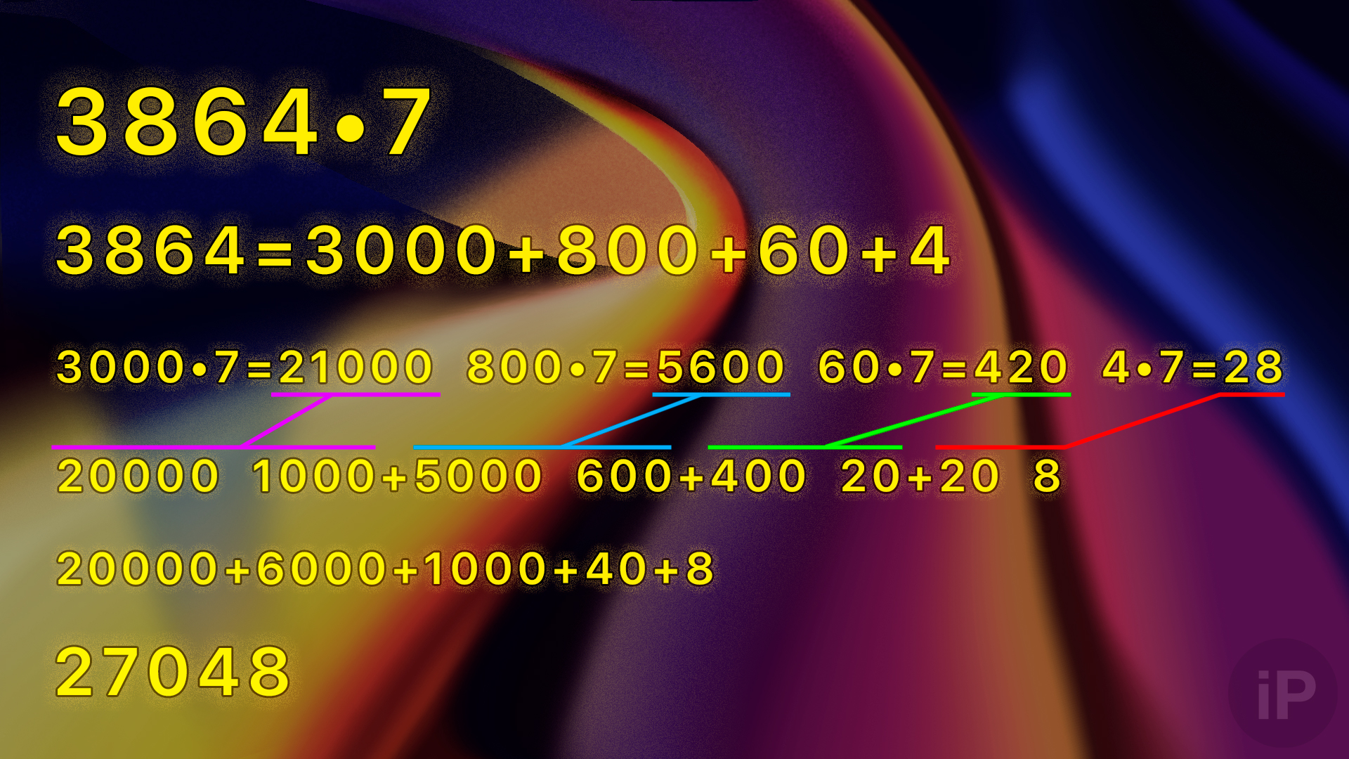 Чтобы получить ответ на, допустим, пример 3864∙7, вам поможет система Разбить-умножить, разбить-сложить.
