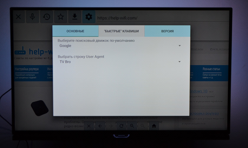 В настройках TV Bro можно сменить поисковую систему и User Agent браузера. Там же можно назначить быстрые клавиши и посмотреть версию установленного браузера.
