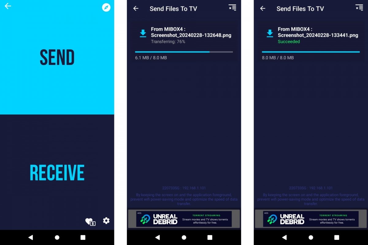 После установки обеих версий на Android TV вы открываете приложение и указываете, что хотите получать файлы: «Отправить», или «Получить». В приложении, установленном на телефоне, вы указываете, что хотите отправить файлы и на какое устройство. Затем вы выбираете установщик APK, который собираетесь установить на телевизор, и отправляете его. Вы принимаете посылку на телевизоре и все. После получения вы можете открыть и установить файл.