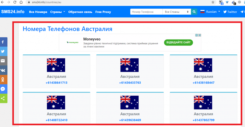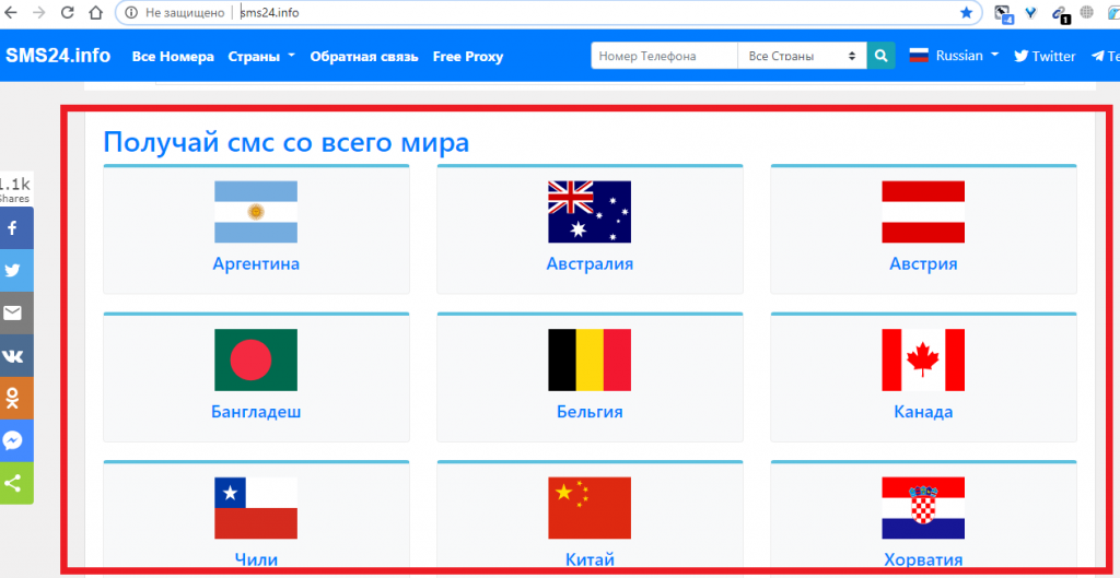 У всех этих сервисов принцип работы одинаков с небольшими отличиями. К примеру, на sms24.info нужно сначала выбрать страну: