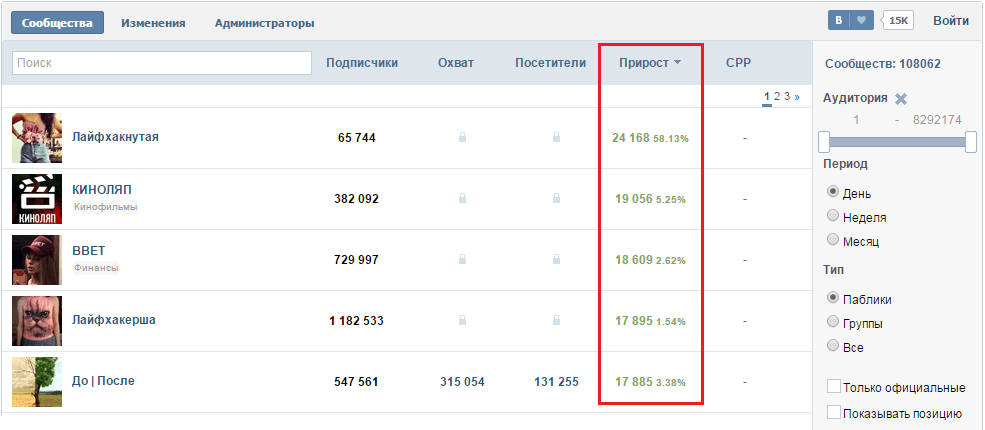 Сообщества, которые Вы сейчас видите — это те, которые отсортированы по приросту участников.