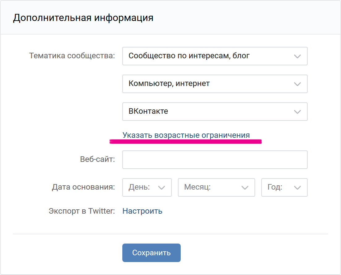 Если в группе нет содержимого «для взрослых», зайди в ней в Управление (в полной версии ВК) и в разделе настроек «Дополнительная информация» нажми Указать возрастные ограничения: