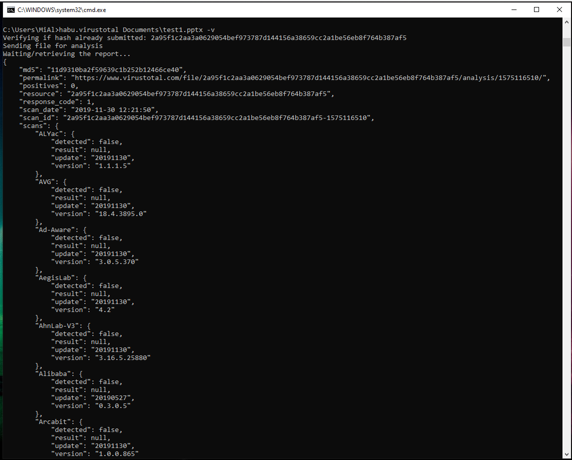 Программа habu.virustotal работает следующим образом: для указанного файла она вычисляет хеш и, без отправки файла, делает запрос, имеется ли в Virustotal отчёт о проверке файла с такой контрольной суммой. Если имеется готовый отчёт, то программа загружает его. Если отчёта нет, то программа отправляет подозрительный файл на Virustotal и ожидает получение отчёта.