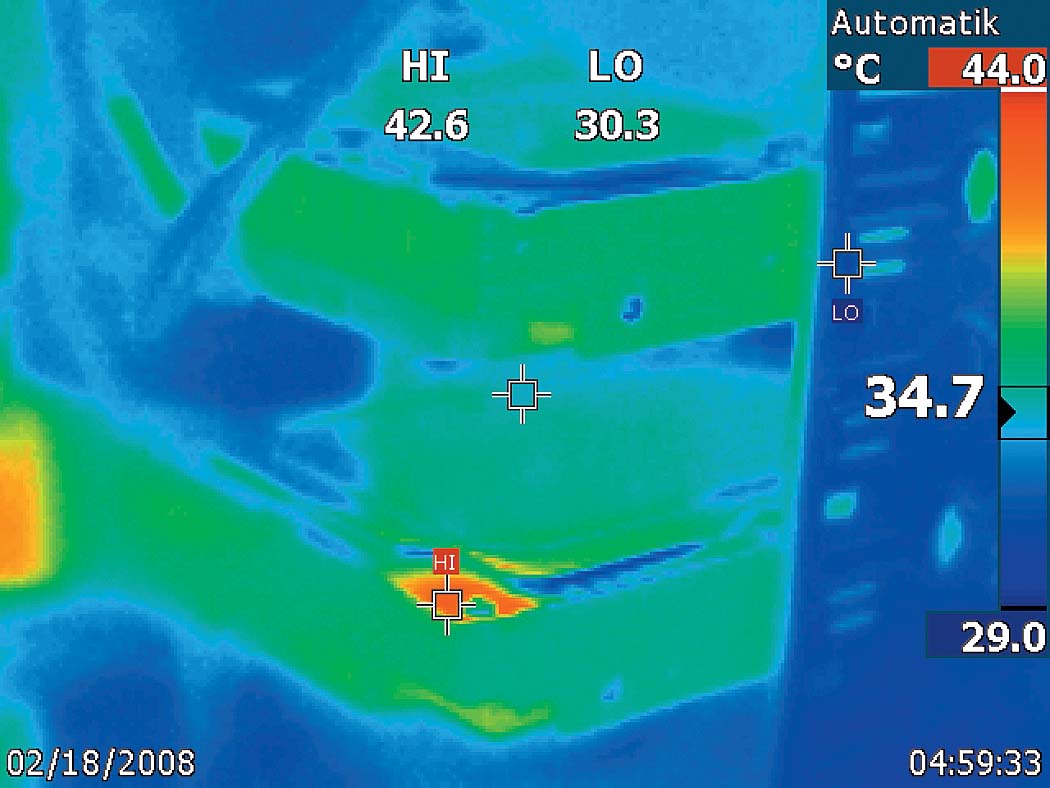 Исследования Google и Blackblaze показали, что высокая рабочая температура HDD не обязательно должна сокращать срок их службы. Однако этот вывод по работе устройств в вычислительных центрах не относится к плохо вентилируемым и тесным системным блокам. На нашей термограмме можно увидеть, как нагреваются два диска, расположенные один над другим. Устанавливайте HDD по крайней мере через один отсек — так воздух будет лучше циркулировать. Диски, расположенные один над другим, будут сами нагреваться и нагревать друг друга. Для охлаждения трех и более носителей в корпусе необходим вентилятор, продувающий приводы. SSD-накопители работают и при высокой температуре (для SSD Samsung, например, рабочая температура достигает 70 °С)