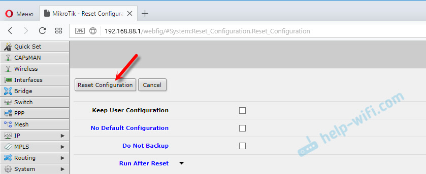 В системе RouterOS, на главной странице нажмите на кнопку «Reset Configuration».