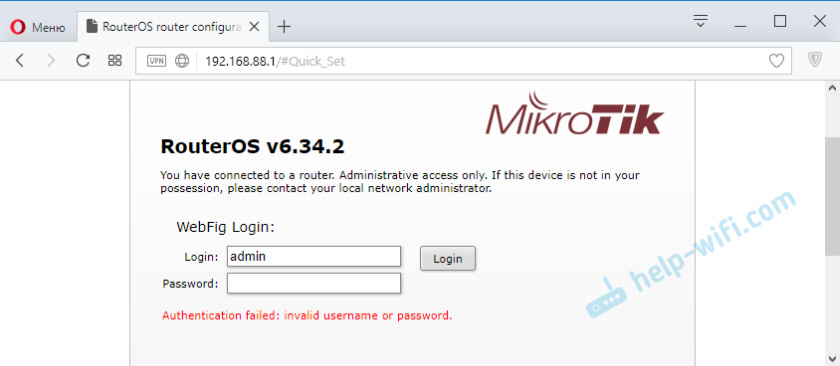Чтобы сбросить конфигурацию через панель управления, нужно сначала открыть ее. Для этого, в браузере перейдите под адресу 192.168.88.1. Я уже писал подробную инструкцию на тему: как зайти в настройки MikroTik.