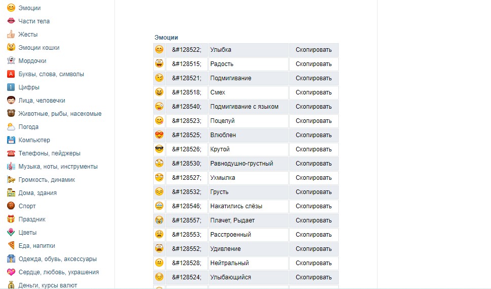 - Кнопка «Скопировать» позволяет быстро скопировать в буфер обмена понравившийся смайл вк из таблицы;