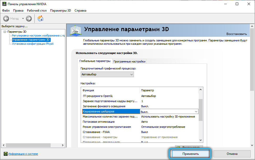 Имеется возможность отключения функции для отдельных приложений через «Программные настройки». Если выбрана опция «Глобальные параметры», то отмена будет касаться всех программных продуктов, использующих технологию шейдеров.