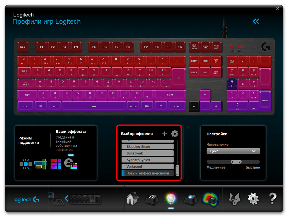 Вместе с этим предлагается выбрать один из заготовленных эффектов (их переключение реализовано и через функциональные клавиши). Среди них может быть эффект для отключения подсветки, поэтому внимательно посмотрите на список.