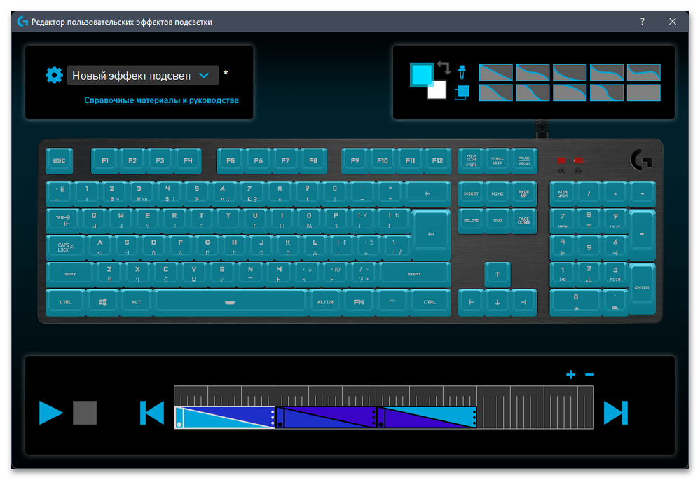Если вы не нашли ни одной кнопки, которая позволила бы отключить подсветку, сделать это можно самостоятельно через создание нового эффекта. Достаточно будет отключить цвет на всех клавишах, например выбрав черный цвет из палитры, и сохранить настройки в своем профиле.