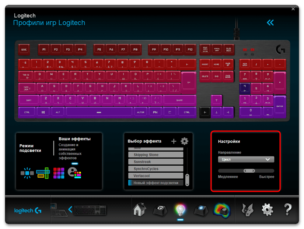 В главном блоке с настройками обычно выбирается скорость подсветки, если она анимированная, ее тип, а также часто присутствует кнопка, позволяющая ее вовсе отключить.