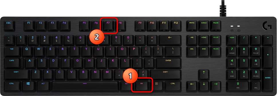 Метод с использованием функциональных клавиш для управления подсветкой проводной или беспроводной клавиатуры практически всегда работает даже без предварительной установки драйверов, поскольку все необходимые настройки уже имеются во внутренней памяти устройства. Чаще всего актуальной комбинацией является Fn + F7, а повторное нажатие по данной клавише сделает подсветку еще ярче или тусклее, что зависит от того, как клавиатура запрограммирована.