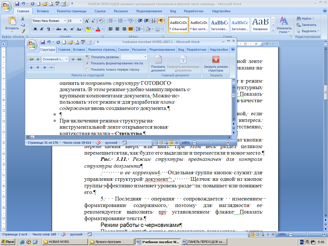 Примечание. Перед тем как передавать законченную работу, обязательно взгляните на нее в режиме структуры. Убедитесь, что все структурные разделы заполнены равномерно, их соподчиненность сомнений не вызывает, а названия понятны, выразительны.