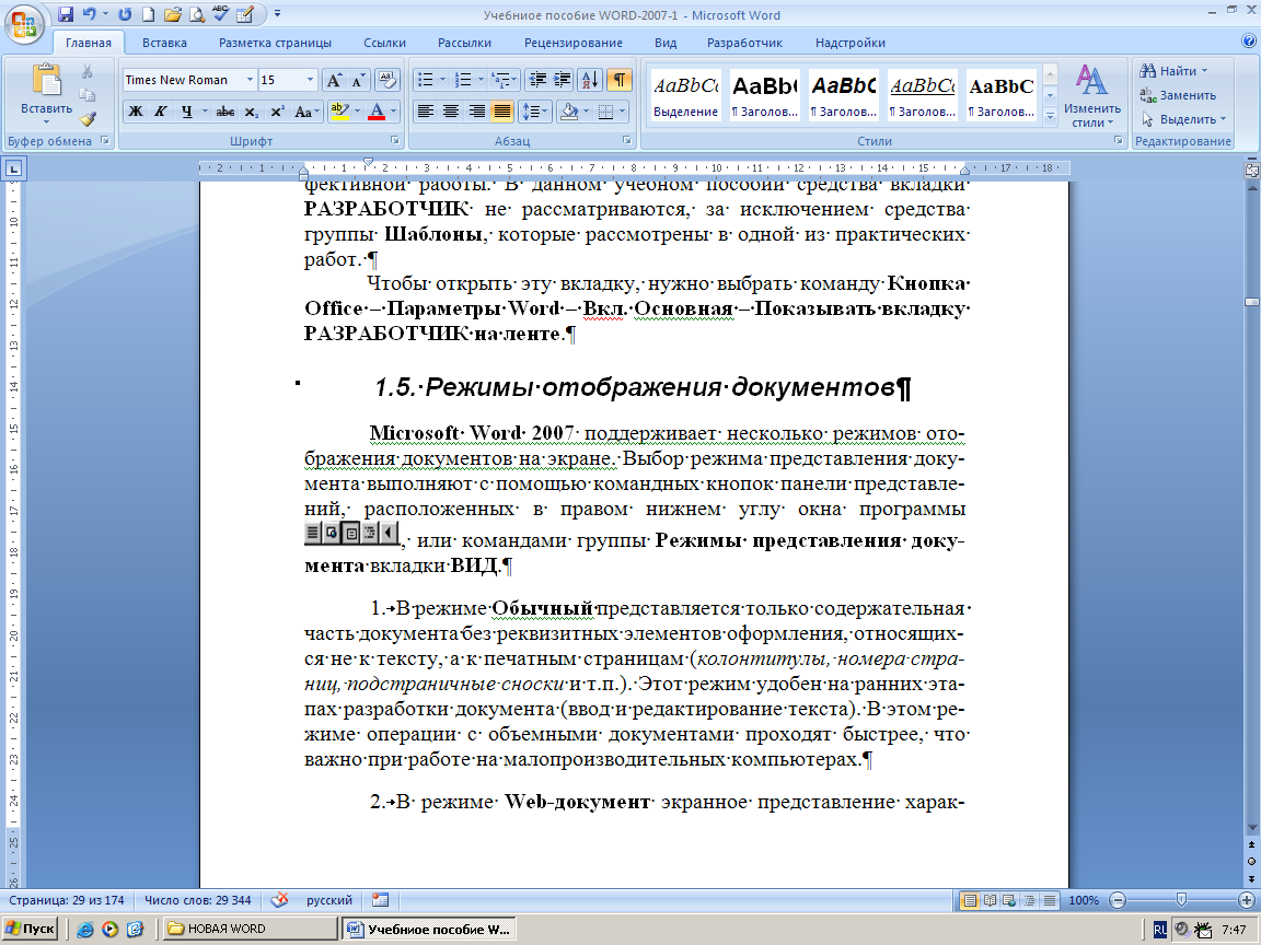 Microsoft Word 2007 поддерживает несколько режимов отображения документов на экране. Выбор режима выполняют с помощью командных кнопок панели представлений, расположенных в правом нижнем углу окна программы