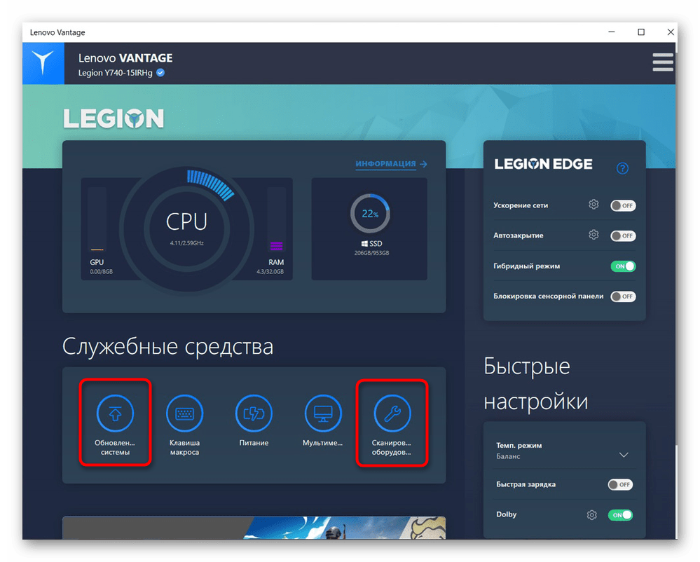 Компания Lenovo тоже разработала собственную программу для повышения производительности ноутбуков и исправления различных ошибок. Она называется Lenovo Vantage и распространяется бесплатно также через Microsoft Store. В данном софте есть раздел для обновления системы и оборудования. Вам предстоит заглянуть в каждый из них, запустить сканирование и дождаться отображения результатов. Если будет предложено скачивание новых версий драйверов, в том числе и для тачпада, подтвердите это действие и по завершении перезагрузите компьютер.
