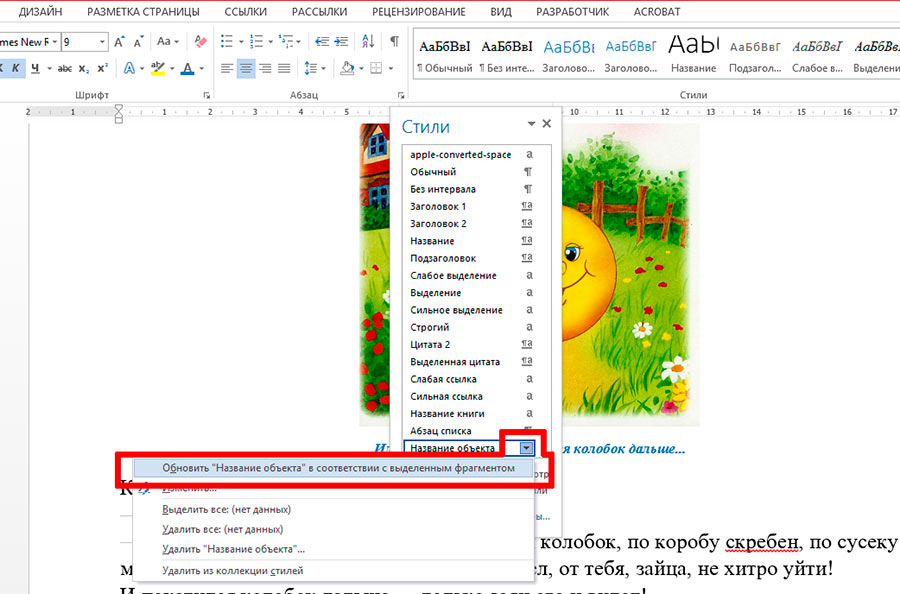 Наведите курсор на правую часть надписи «Название объекта» и нажмите левую кнопку мыши, чтобы развернуть окно дополнительных настроек. Выбираем самый первый пункт «Обновить «Название объекта» в соответствии с выделенным фрагментом» и закрываем окно «Стили».