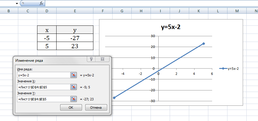 Далее следует осуществить выбор данных, а именно участок ячеек вдоль оси абсцисс и оси ординат. Этому участку можно присвоить имя самой функции, заключив его в кавычки, «y = 5х – 2» или задать другое имя. В итоге будет следующее: