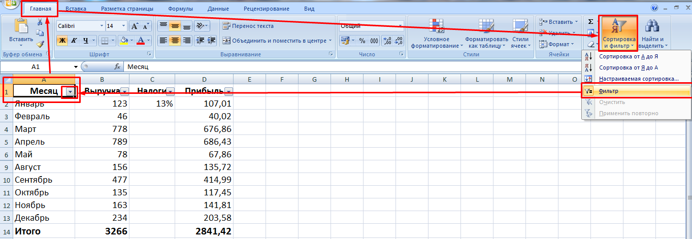 Фильтрация данных — еще один способ скрыть информацию. Установите курсор в нужную ячейку, перейдите в блок редактирования на главной вкладке, нажмите кнопку «Сортировка и фильтр», а затем выберите «Фильтр» из выпадающего списка. Если все сделано правильно, в ячейке появится стрелка вниз.