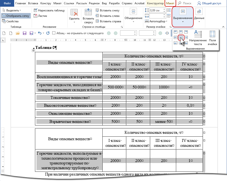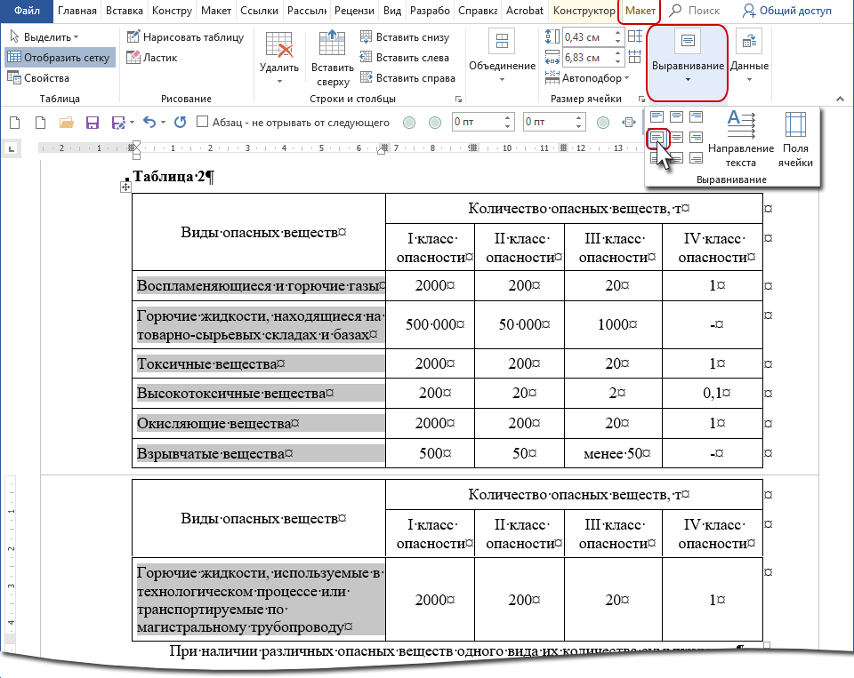 Шаг 4. Выровняйте первый столбец справа по центру (выберите первый столбец, кроме первой ячейки → лента макета → группа команд «Выровнять» → команда «Выровнять по центру по левому краю):