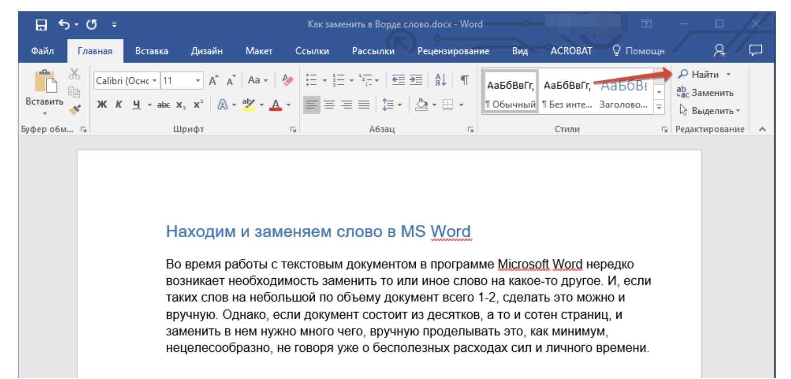 - В специальное окно «Найти» вводите слово, которое нужно изменить по всему тексту.