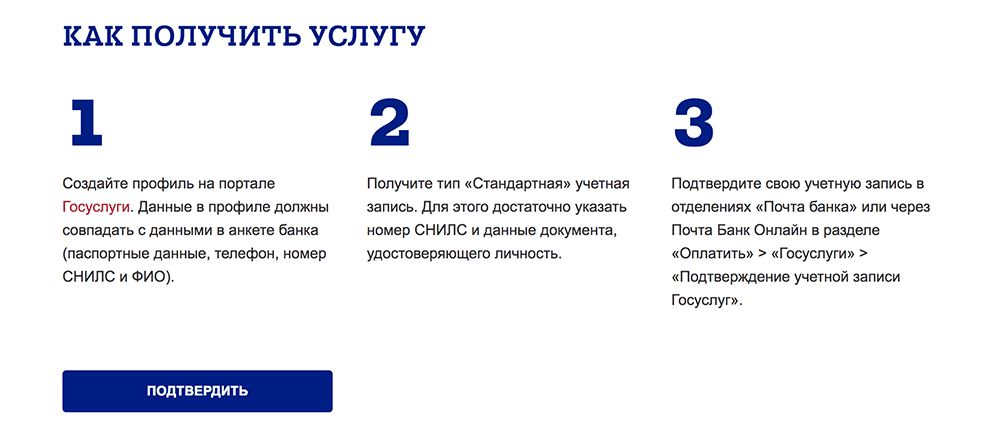 Чтобы полноценно пользоваться государственными услугами через интернет, вам необходимо иметь подтвержденную учетную запись. На портале существует 3 способа подтверждения личности: личное посещение ближайшего центра обслуживания (отделение ФГУП «Почта России», МФЦ России, центр обслуживания клиентов ОАО «Ростелеком», и др.); интернет-банк Сбербанка, Тинькофф Банка, Почта Банка, Банка ВТБ, Банка Санкт-Петербург, Ак Барс Банка, СКБ Банка, Газэнергобанка, ДелоБанка; ввод на сайте персонального кода подтверждения, полученного из заказного письма от официального сайта Госуслуг.