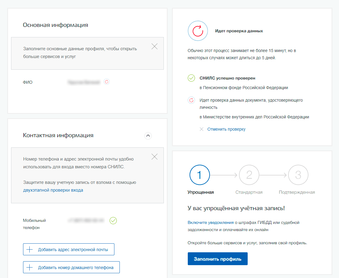 После заполнения формы на предыдущем этапе, указанные личные данные отправляются на автоматическую проверку в Пенсионный Фонд РФ и МВД.