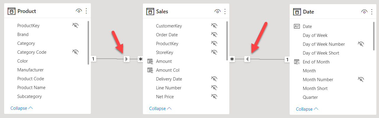 Направление распространения контекста фильтра отражается стрелкой в середине любого отношения в представлении схемы Power BI.