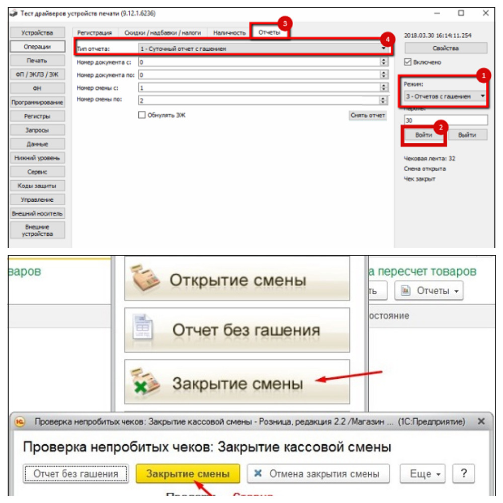 - При попытках совершения закрытия смены, если это делается через драйвер ККМ;