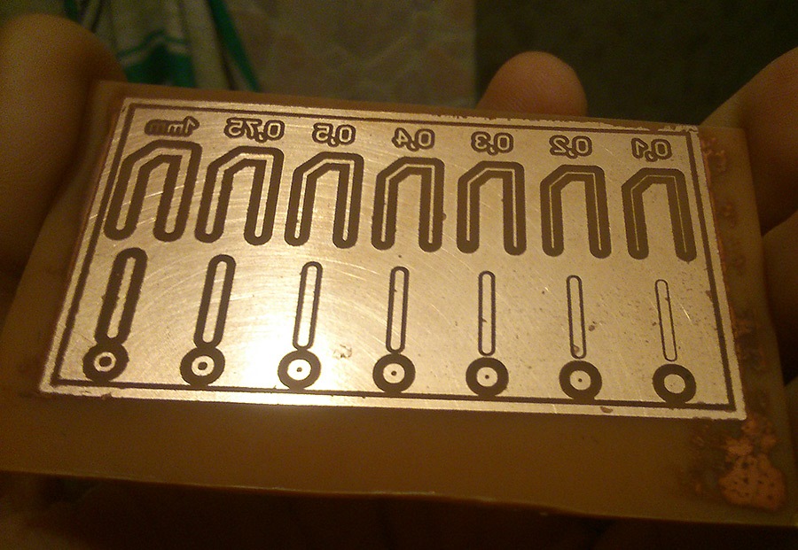 С качественным стеклотекстолитом FR4 и хорошей обработкой поверхности, результат — просто отличный! Естественно с утюгом я такого не мог получить, а времени уходило в разы больше. Ну и фото с линейкой для достоверности, разрывов дорожек нет: