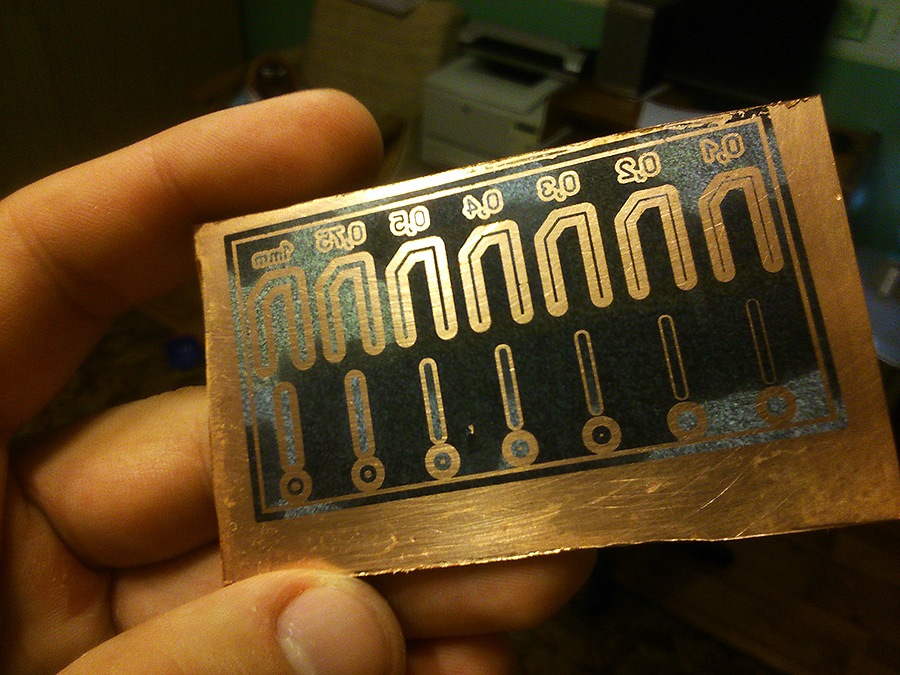 Виден результат, правда это был старый покоцанный текстолит FR2, и там где дорожки 0,75-1 мм я все же плохо обработал поверхность перед переводом тонера, поэтому они вышли не аккуратно…