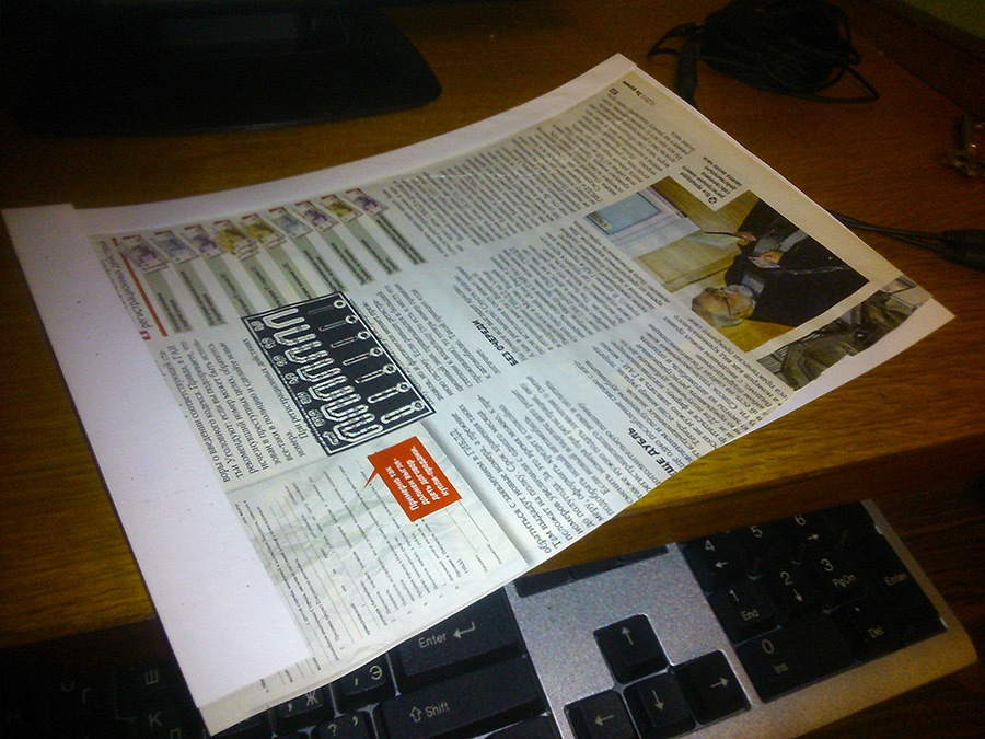 Вырезаем и кладем на текстолит, а сам текстолит опять в бумагу, дабы не повредить и не испачкать им валы ламинатора, и что бы схемка не съезжала: