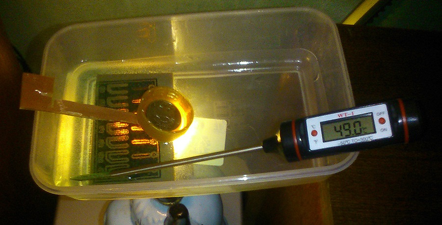 После остывания кладу текстолит под кран, и пускаю тонюсенькую струйку на 5 минут: