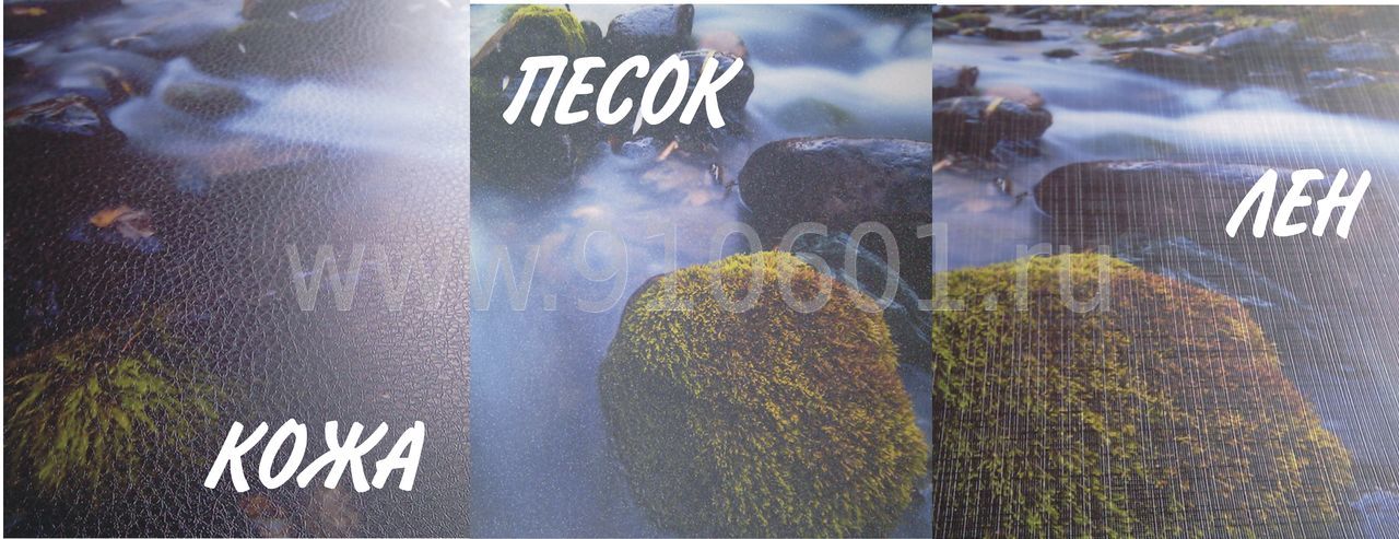 Текстурные пленки изготавливаются на основе ПВХ — эластичного материала с низкой температурой плавления. Толщина их варьирует в пределах 40…50 мкм. «Кожа», «песок», «холст», «зерно» — самые популярные тиснения, но есть и необычные -морозные узоры, голограммы, кристаллы. Такой упаковочный материал стоит намного дороже обычной матовой или глянцевой пленки. Его можно мять, скручивать, он не боится лучей УФ и биговки. Единственный его недостаток — высокая цена, поэтому для больших тиражей использовать текстурную пленку слишком накладно. Ее покупают для ламинации свадебных фотоальбомов, сувениров, ценных постеров и афиш.