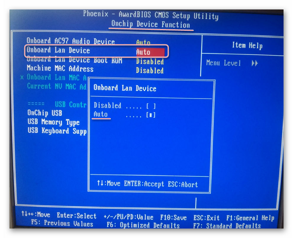 Теперь найдите и выберите пункт «OnBoard Lan Device». Если напротив него стоит значение «Disable», то нажмите по нему клавишей Enter и установите параметр «Auto», что позволит включить сетевую карту.