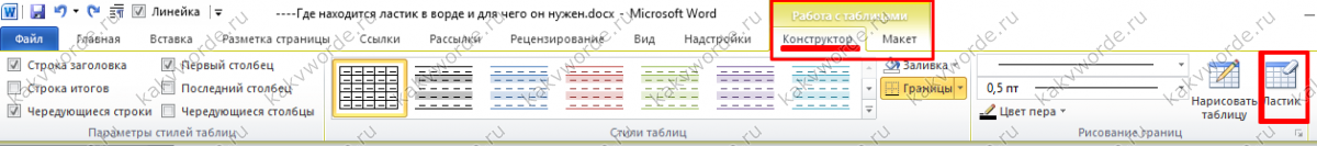 Для начала необходимо установить курсор в одну из ячеек в таблице. Только после этого действия появится ластик. Далее нужно перейти во вкладку «Работа с таблицами» — «Конструктор» — «Ластик».