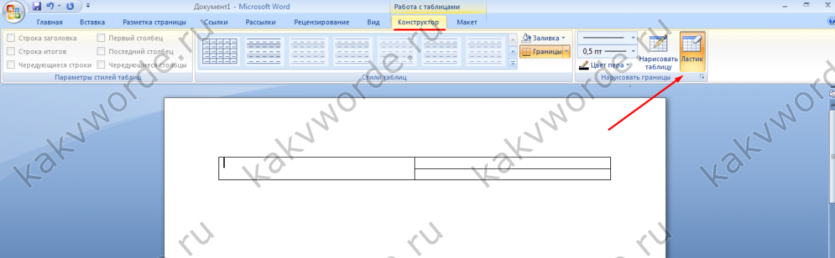 В Ворде 2007 нужно установить курсор в ячейку таблицы (точно также как и для версии 2010). Затем, появится вкладка «Конструктор» в которой находится ластик.