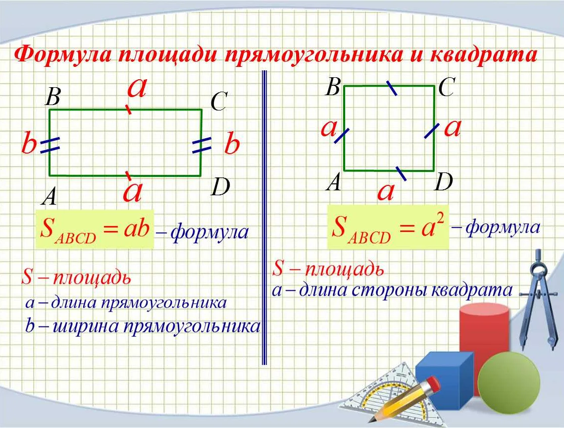 Прямоугольник: площадь прямоугольника равна произведению длины на ширину. Записывается как S = a*b, где a и b — длины сторон.