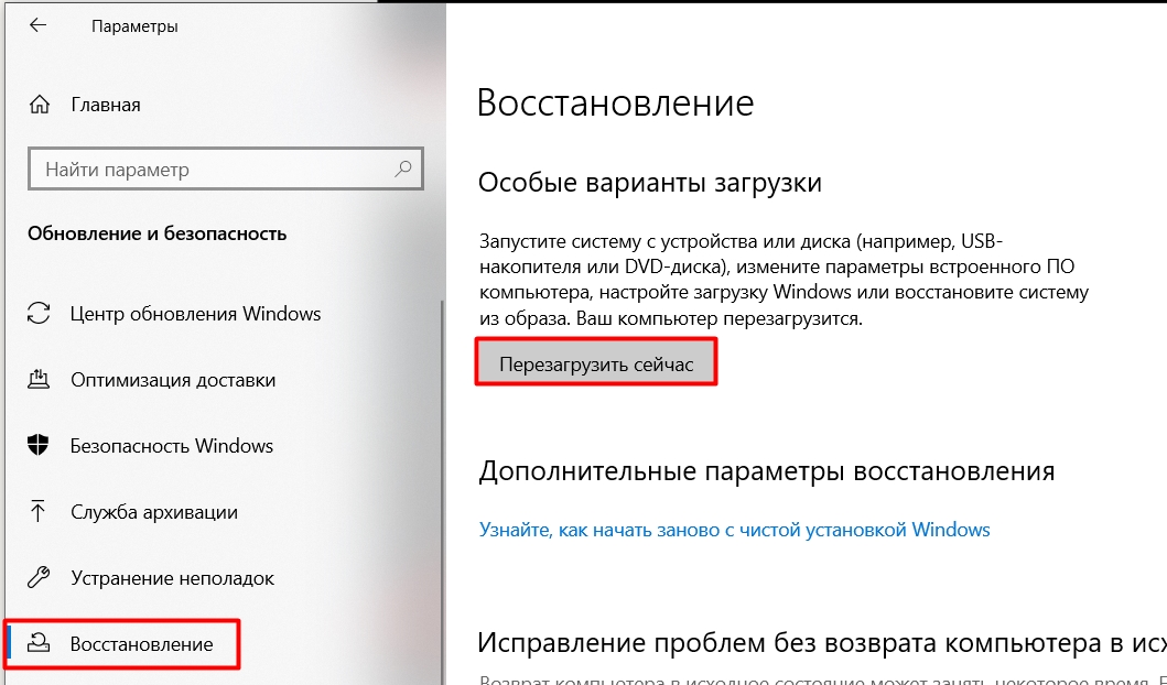 Слева находим подраздел «Восстановление» и в правом блоке в разделе «Особые варианты загрузки» жмем по кнопке перезагрузки. Более педантичные ребята могут прочесть что тут написано и испугаться, что нам нужна загрузочная флешка или диск. Спешу успокоить – подобного не потребуется.