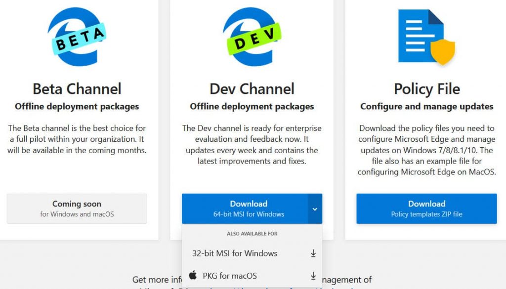- Посетите microsoftedgeinsider.com/enterprise. Выберите канал, который вам нужен;