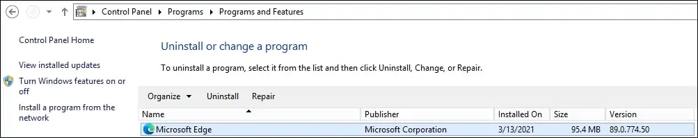 - В списке установленных программ найдите «Microsoft Edge Installer» и выделите его.