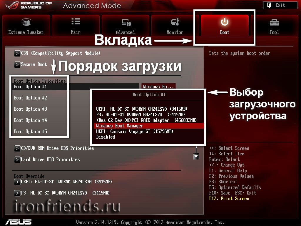 Зайдя в «Advanced Mode (F7)» и перейдя во вкладку «Boot», вы можете изменить приоритет загрузки вручную в разделе «Boot Option Priorities». Или просто выбрать нужное устройство начать с него загрузку в разделе «Boot Override», который находится всё в той же вкладке «Boot».