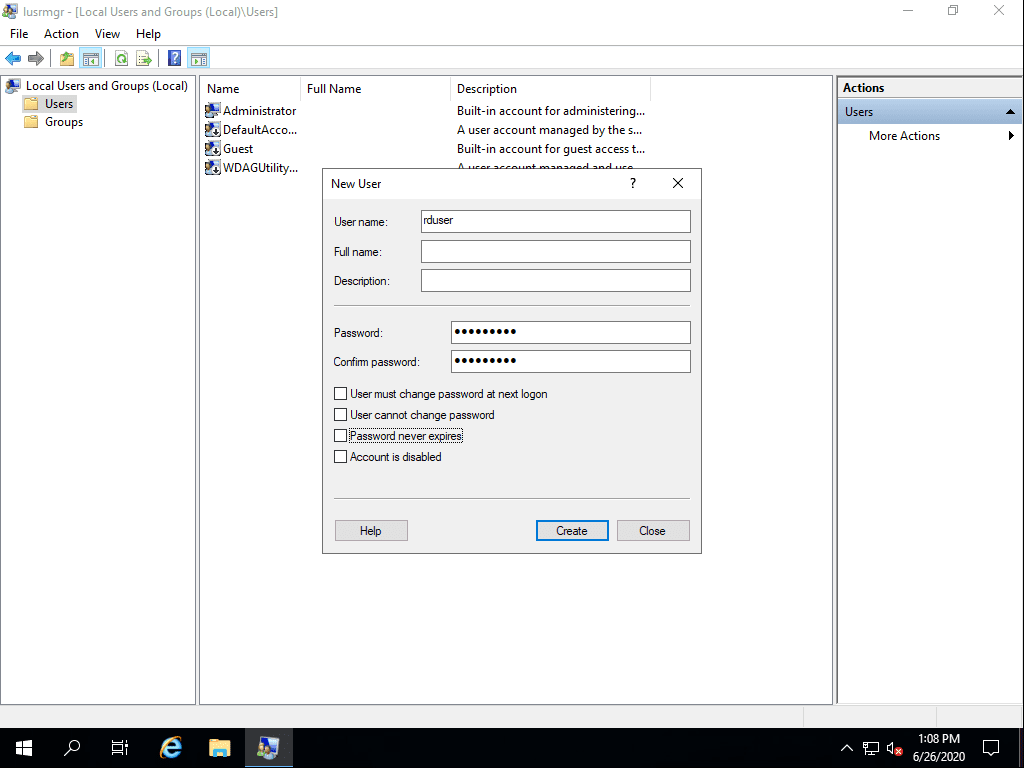 Now, create your local user(s) that will be used to connect to the Windows Server 2019 Workgroup remote desktop services server.