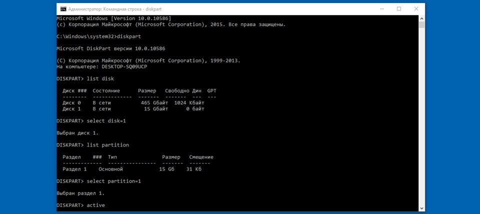 », нажимаем Enter. - Последняя команда, которую мы набираем, чтобы сделать этот раздел активным: «active
