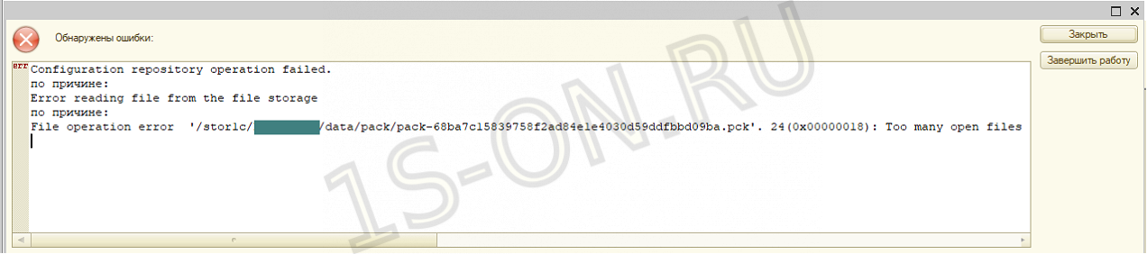 Окно ошибки хранилища 1С «Too many open files»