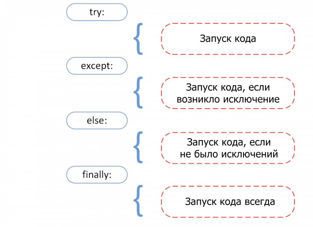 Обработка собственных исключений осуществляется аналогично обработке стандартных исключений, с использованием конструкций try и except: