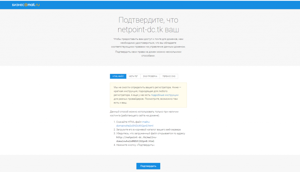 После того, как вы убедились в том, что запись TXT доступна, можно нажать на кнопку подтверждения: