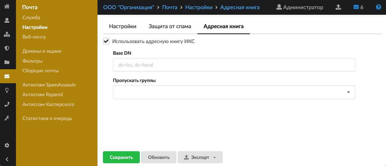 - флаг «Использовать Адресную книгу ИКС» — позволяет включить или выключить использование адресной книги всеми почтовыми клиентами. Передача адресной книги в Roundcube настраивается в веб-почте;
