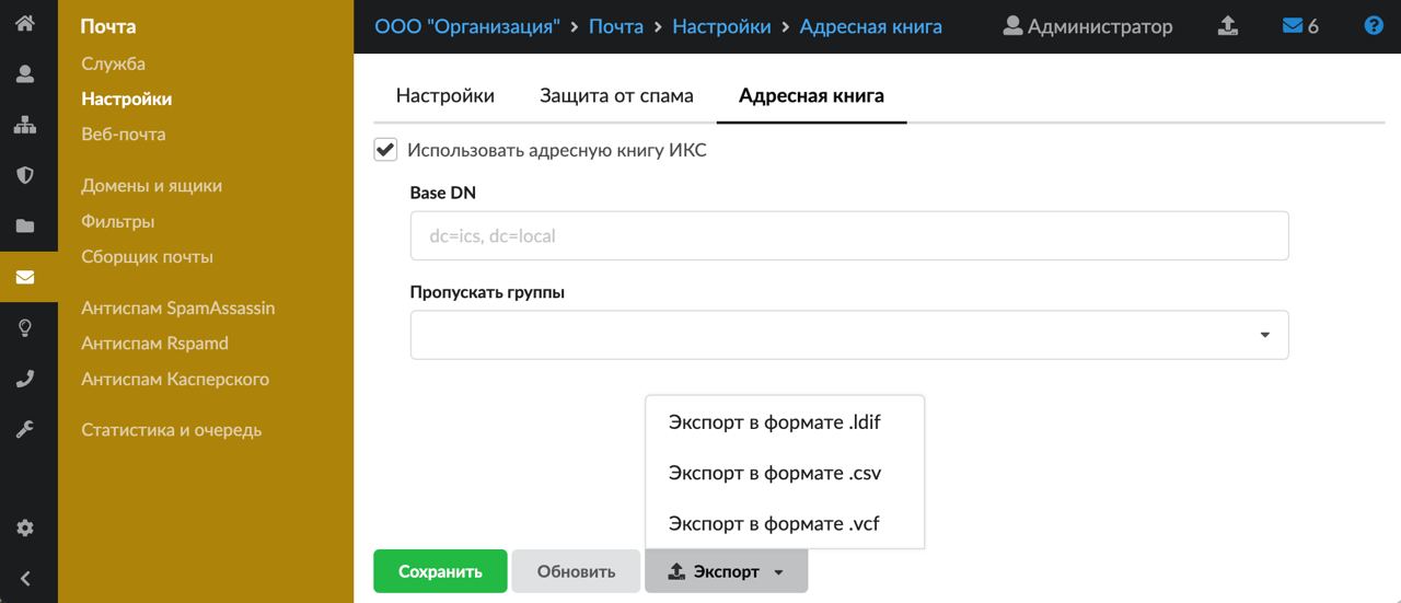 Также на вкладке можно экспортировать адресную книгу в одном из следующих форматов: