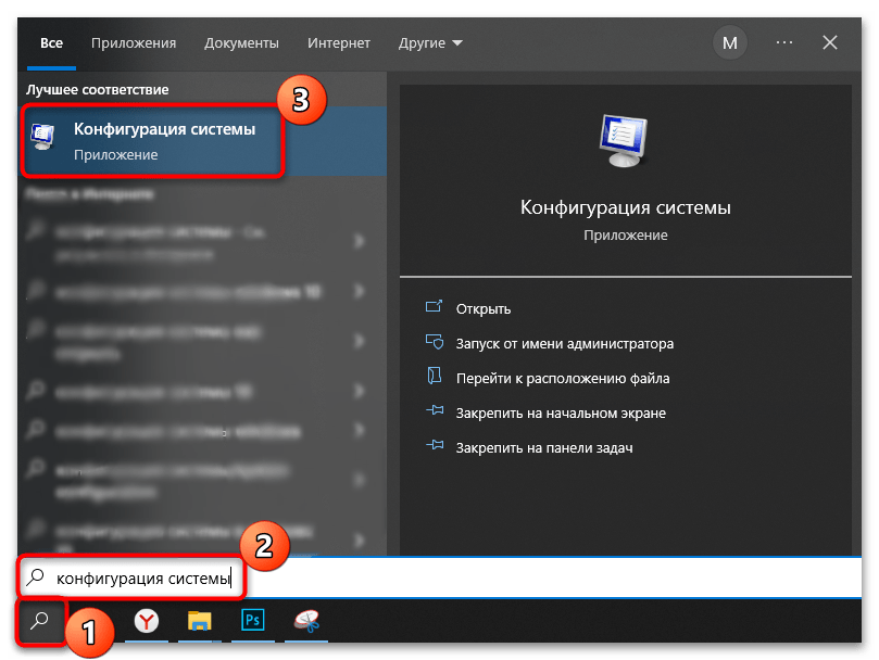 - Через поиск «Пуска» отыщите штатное средство «Конфигурация системы».